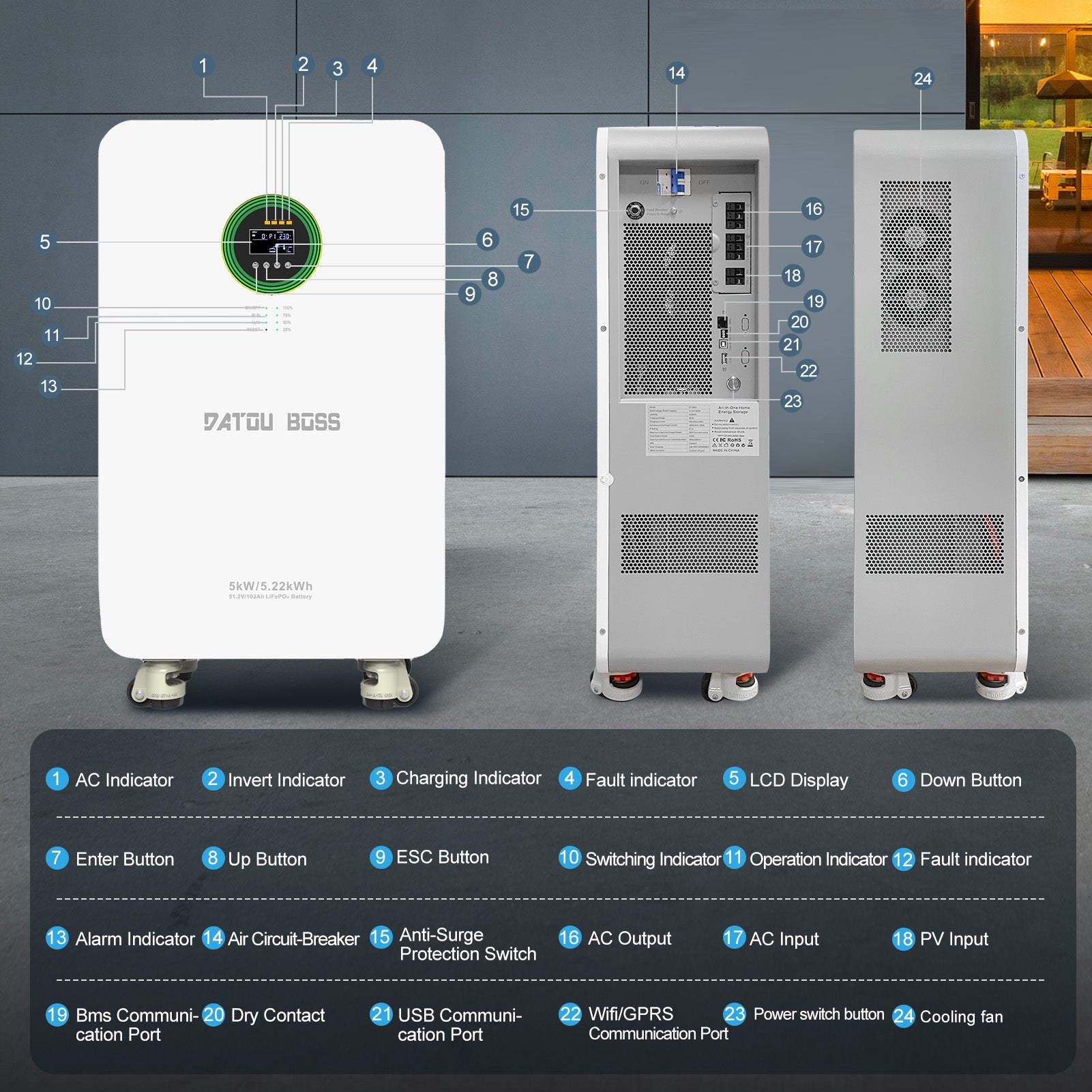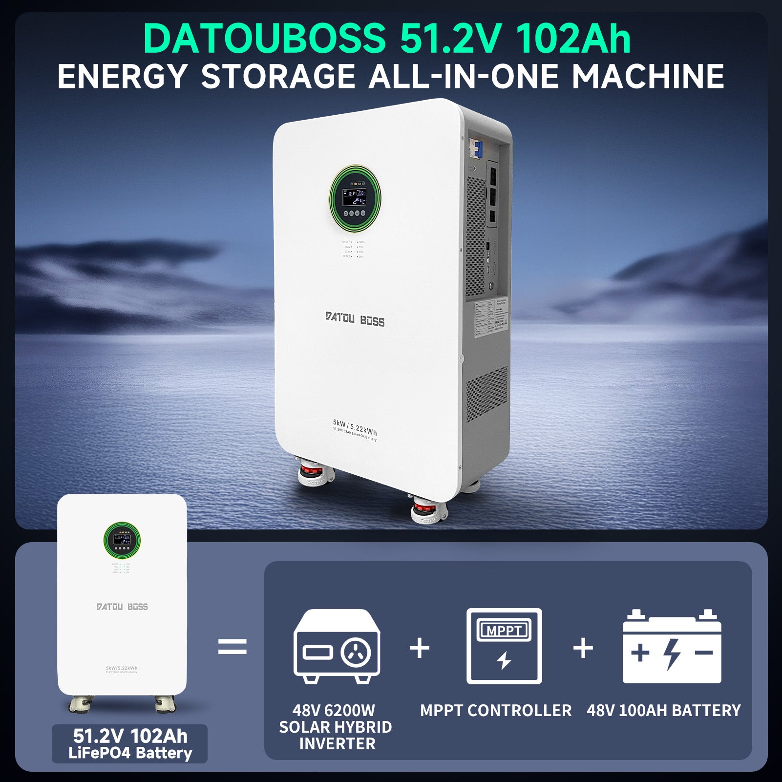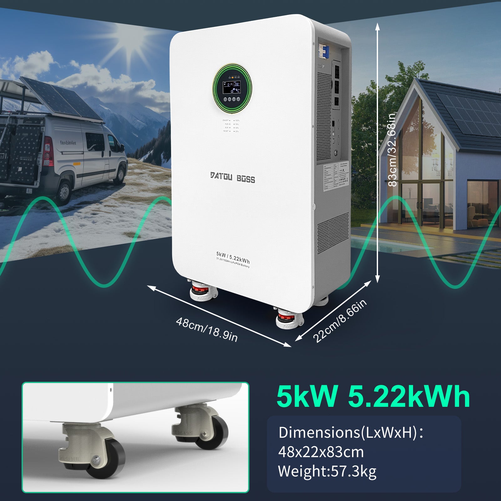 DATOUBOSS 48V 5000W Hybrid Inverter + 102Ah LiFePO4 Battery Portable Power Supply with LCD Touch Screen, Detachable, and Wheels, suitable for large-capacity solar energy storage systems/RVs/home energy storage systems(With Free WiFi)