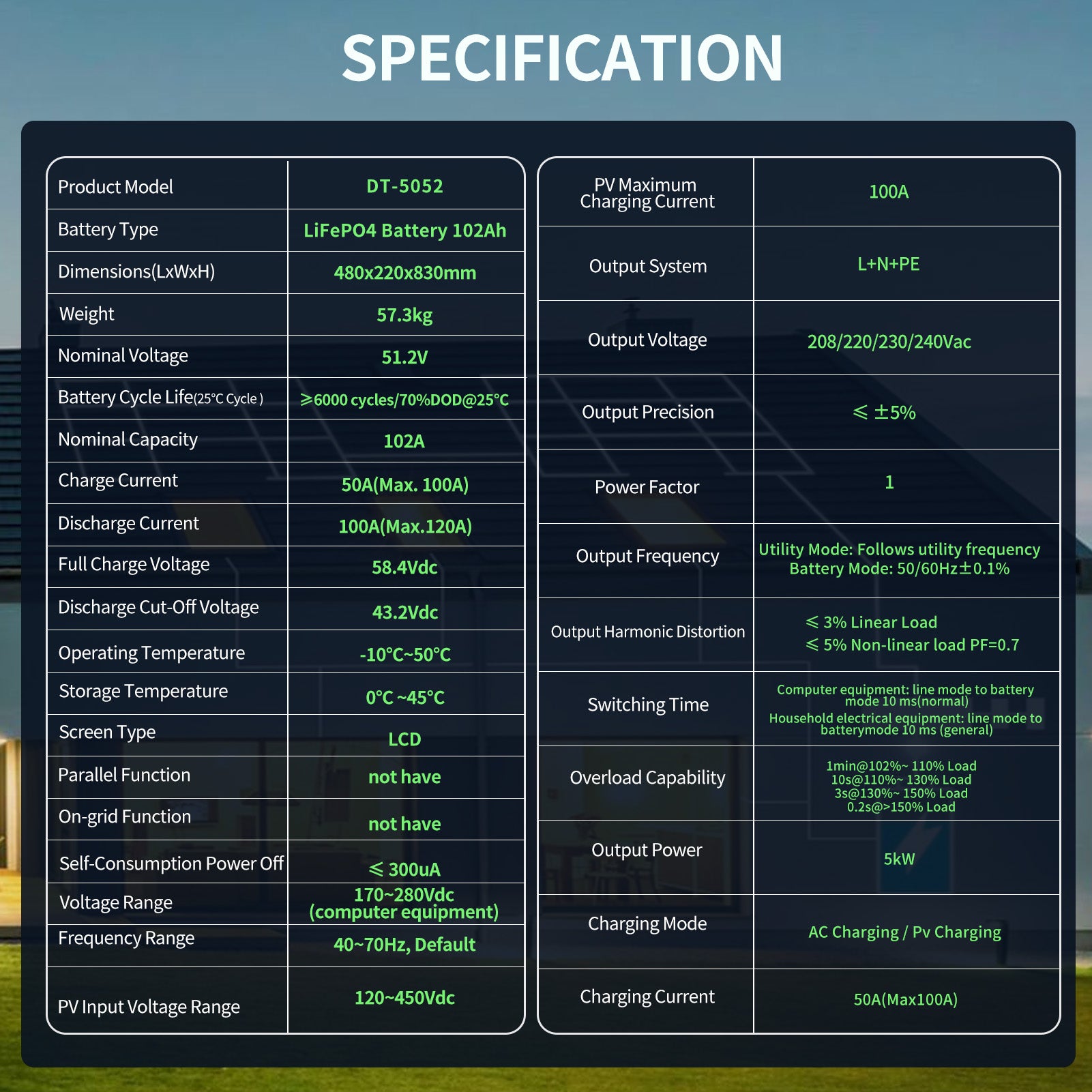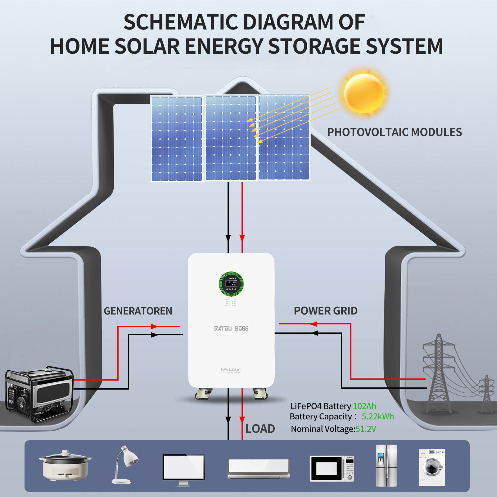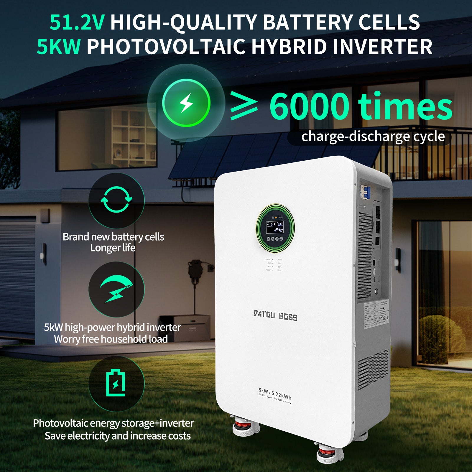 DATOUBOSS 48V 5000W Hybrid Inverter + 102Ah LiFePO4 Battery Portable Power Supply with LCD Touch Screen, Detachable, and Wheels, suitable for large-capacity solar energy storage systems/RVs/home energy storage systems(With Free WiFi)