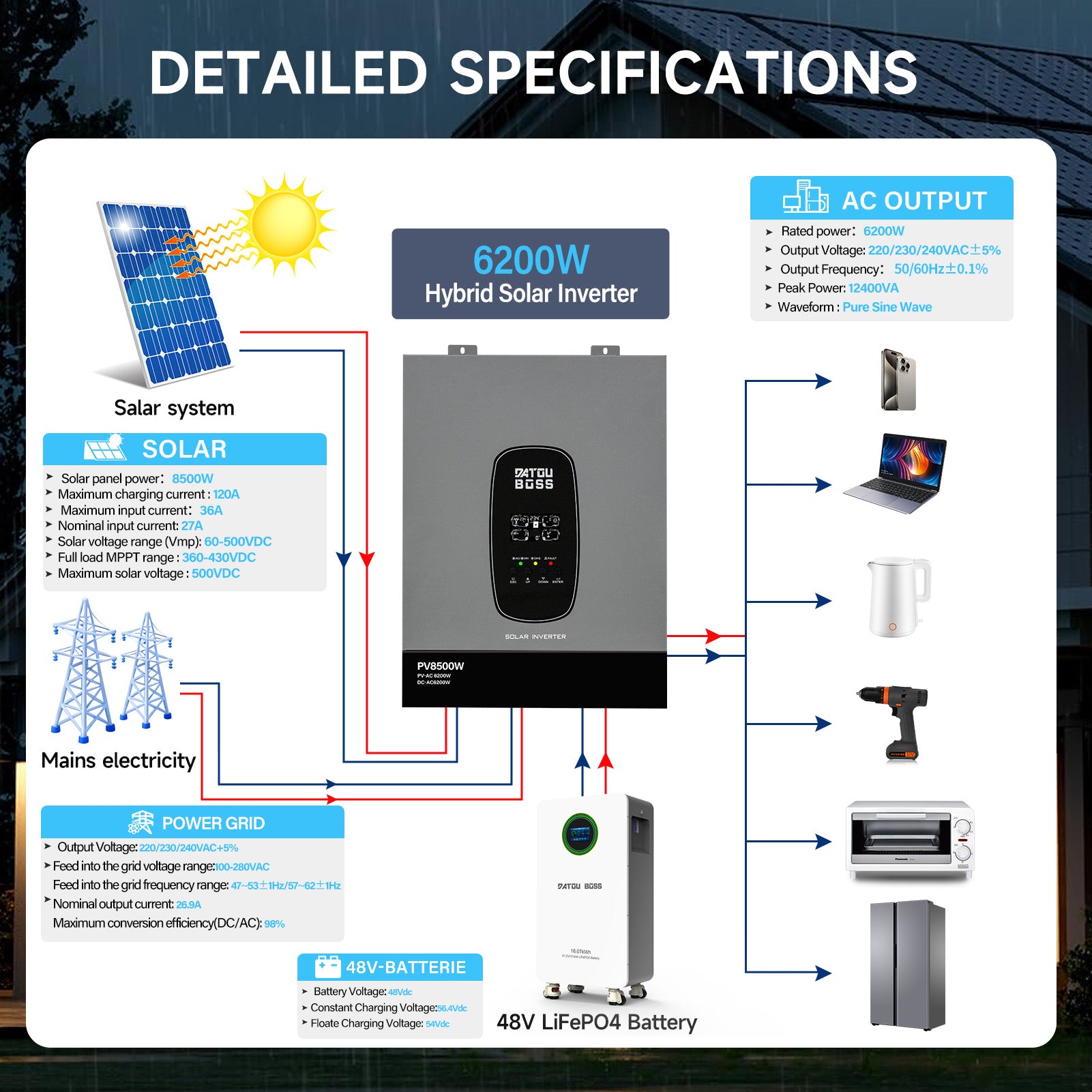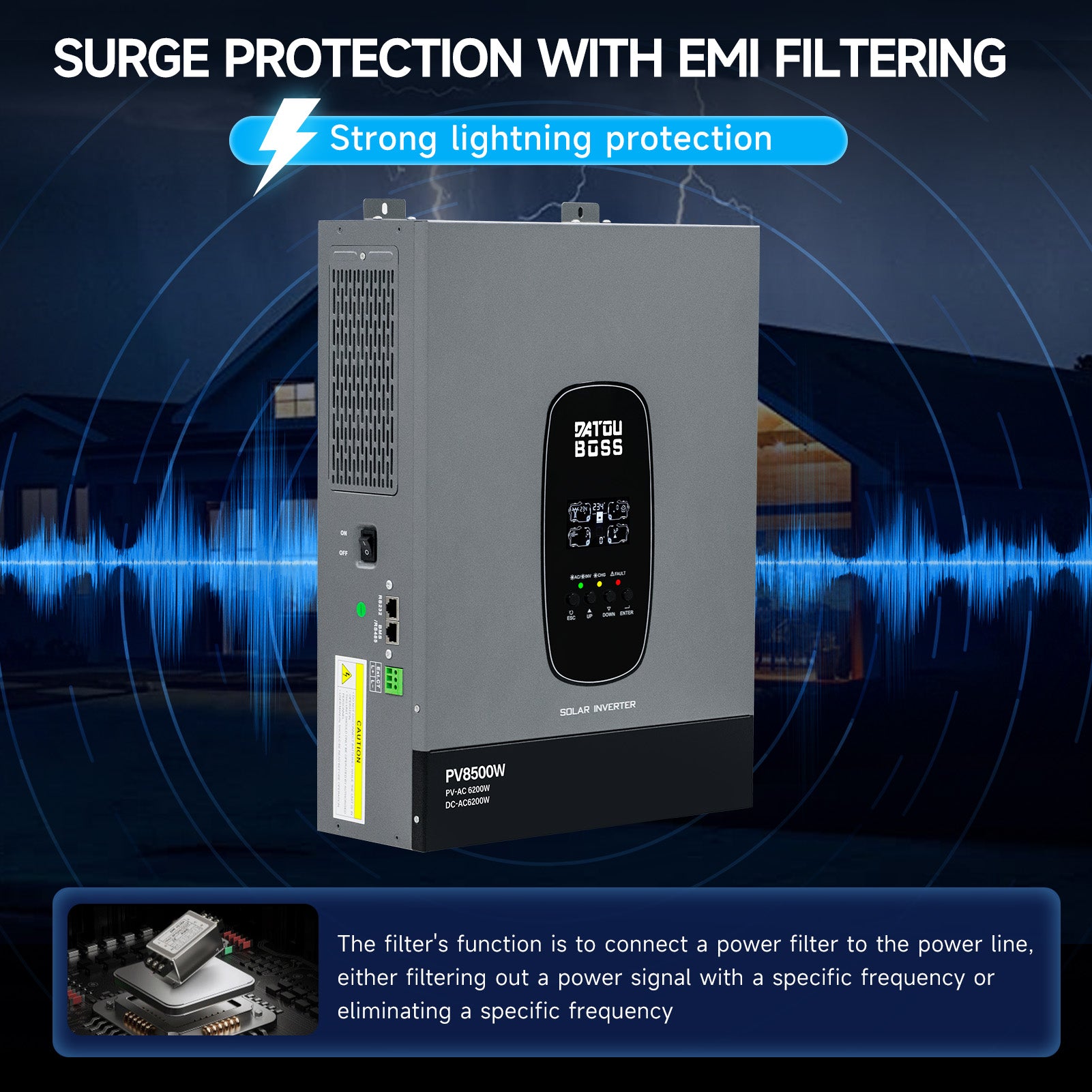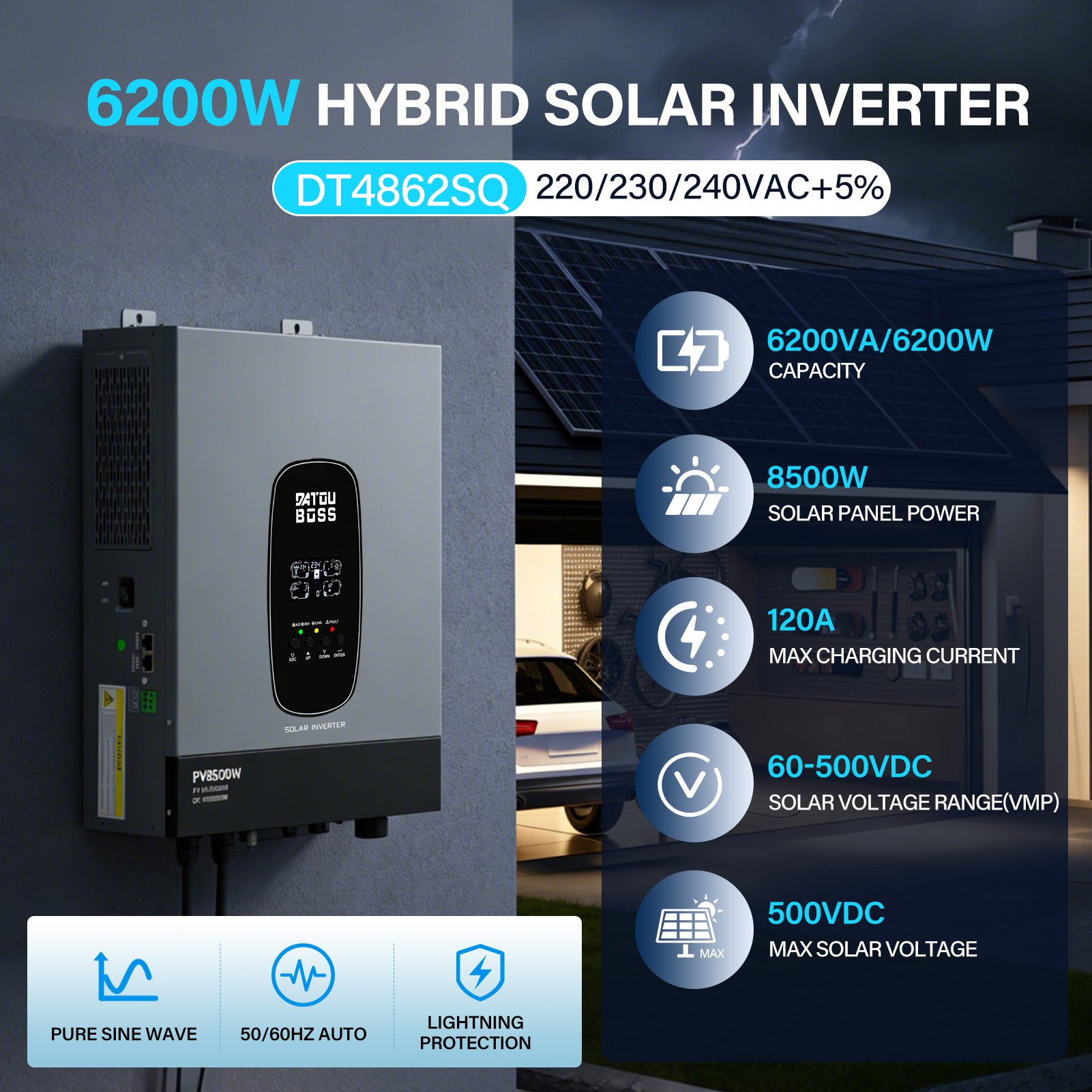 DATOUBOSS 6200W Solar Hybrid Inverter 48VDC till 230VAC, 120A MPPT, 8500W PV-ingång, batterifri drift, BMS-skydd, 27A PV-ingång, blixtnedslag & Anti-Backflow Protection, Off-Grid-kompatibel(Compatible) WiFi-kompatibel 0